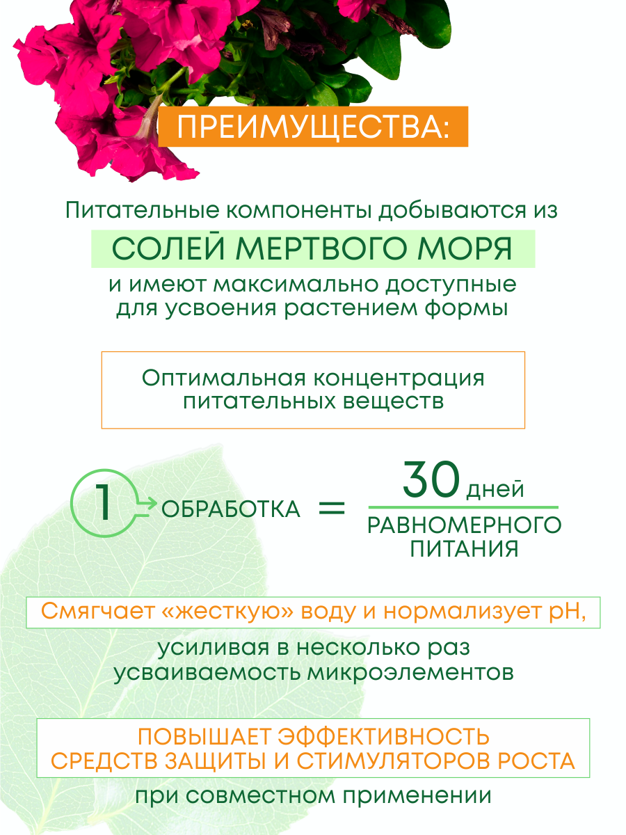 · Питательные компоненты добываются из солей мертвого моря и имеют максимально доступные для усвоения растением формы.
