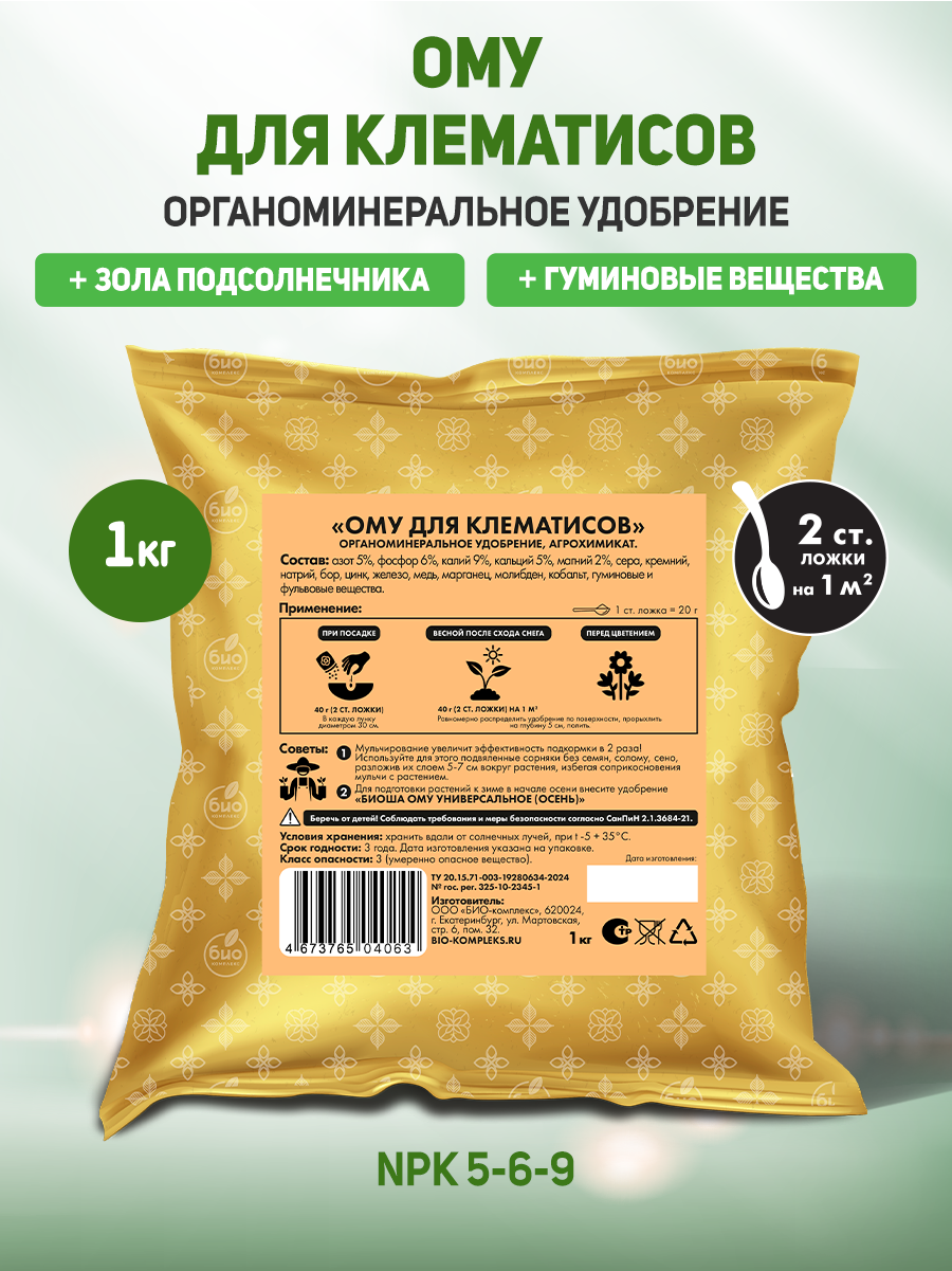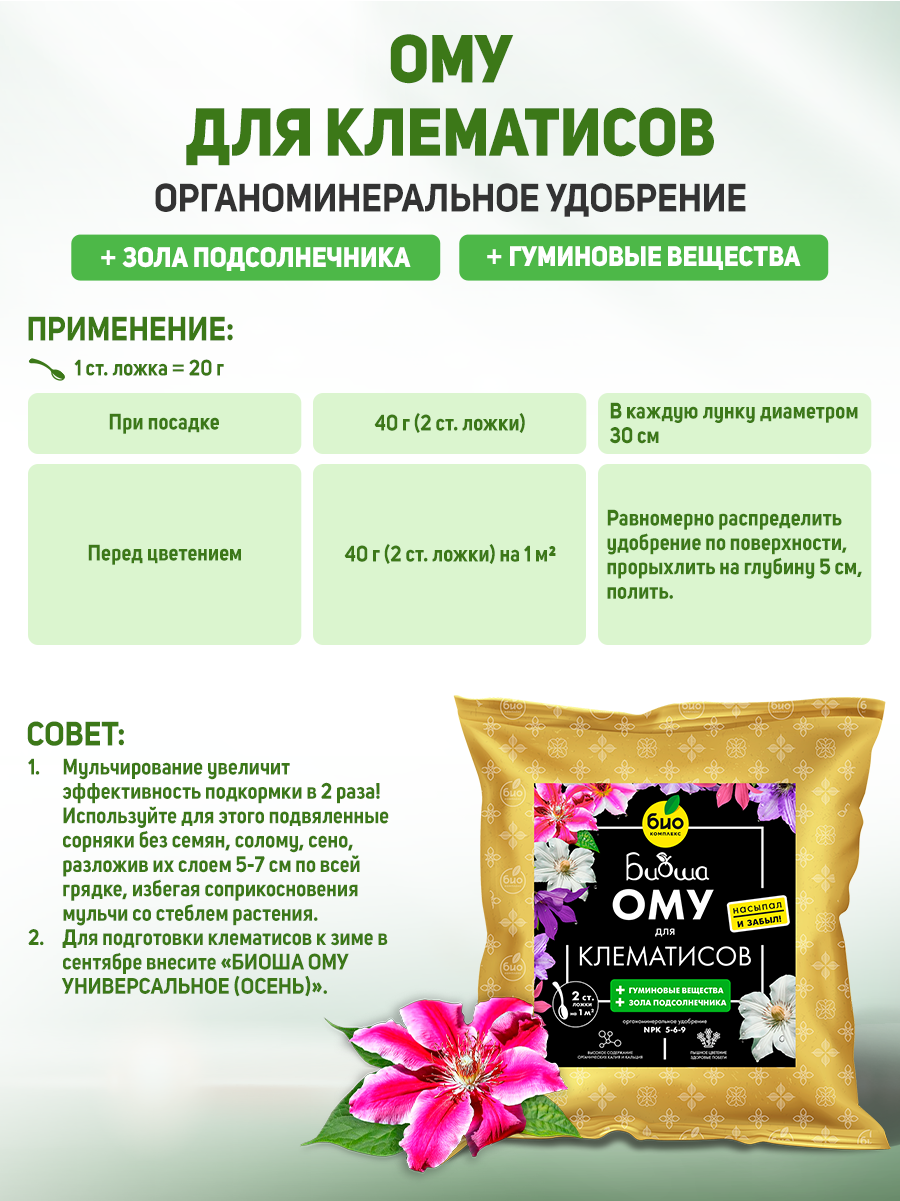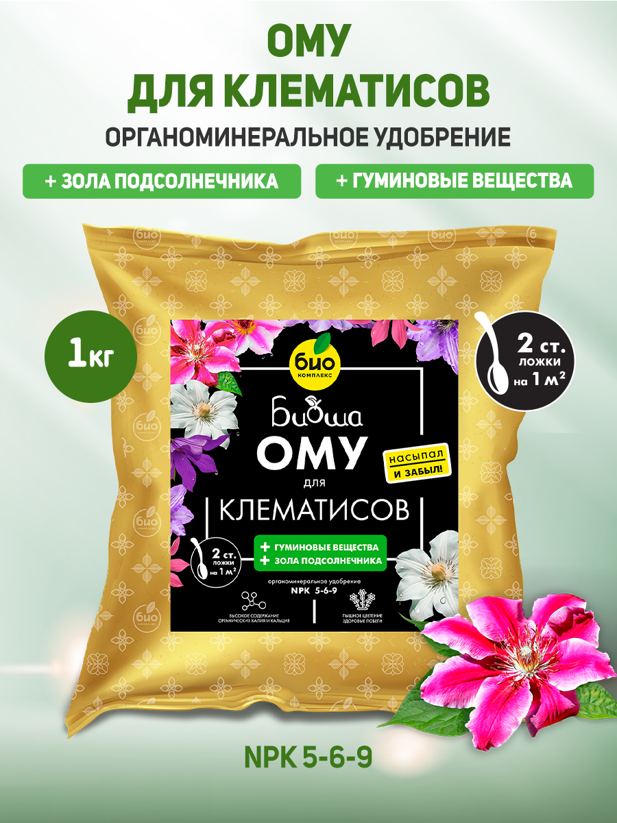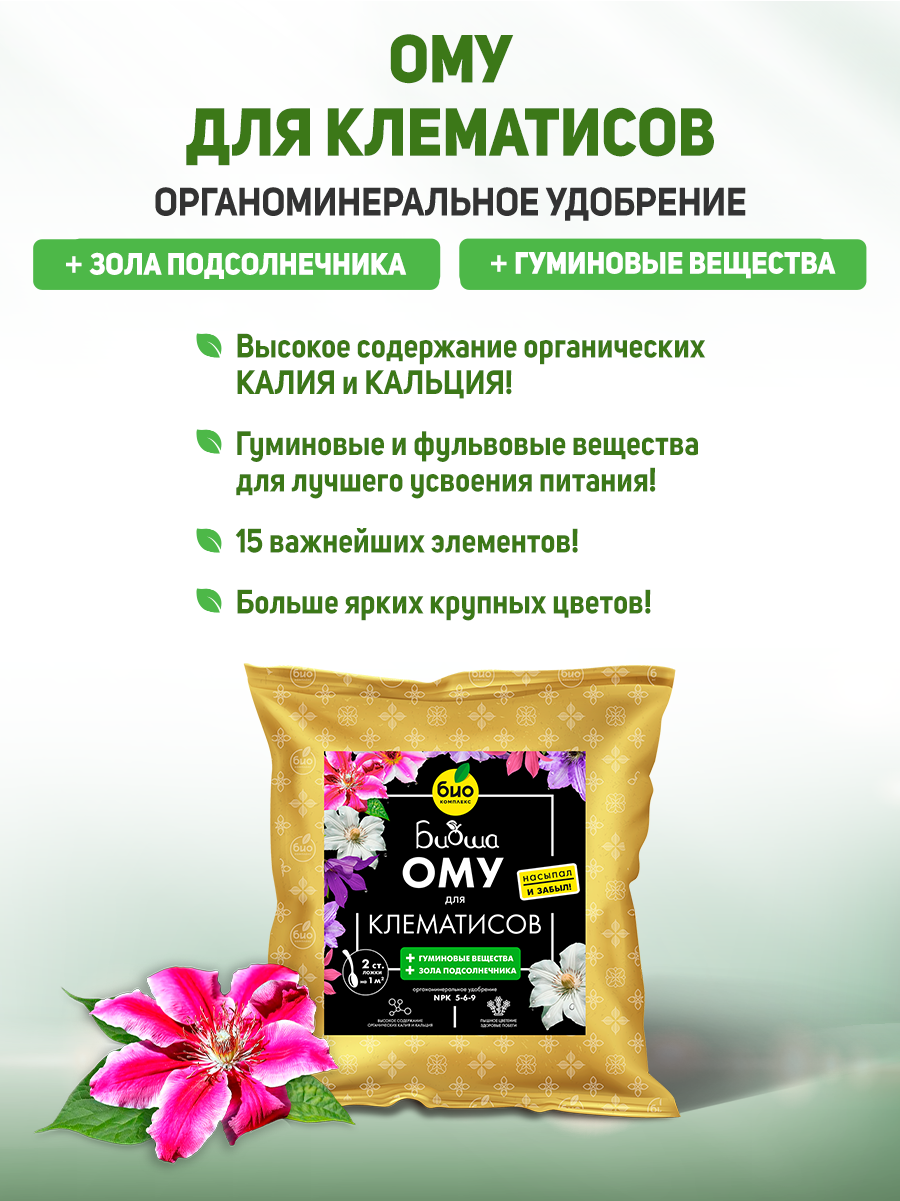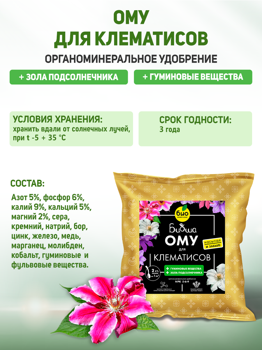 ОМУ ДЛЯ КЛЕМАТИСОВ - смесь минеральных компонентов с гранулированной золой подсолнечника и гуминовыми веществами.