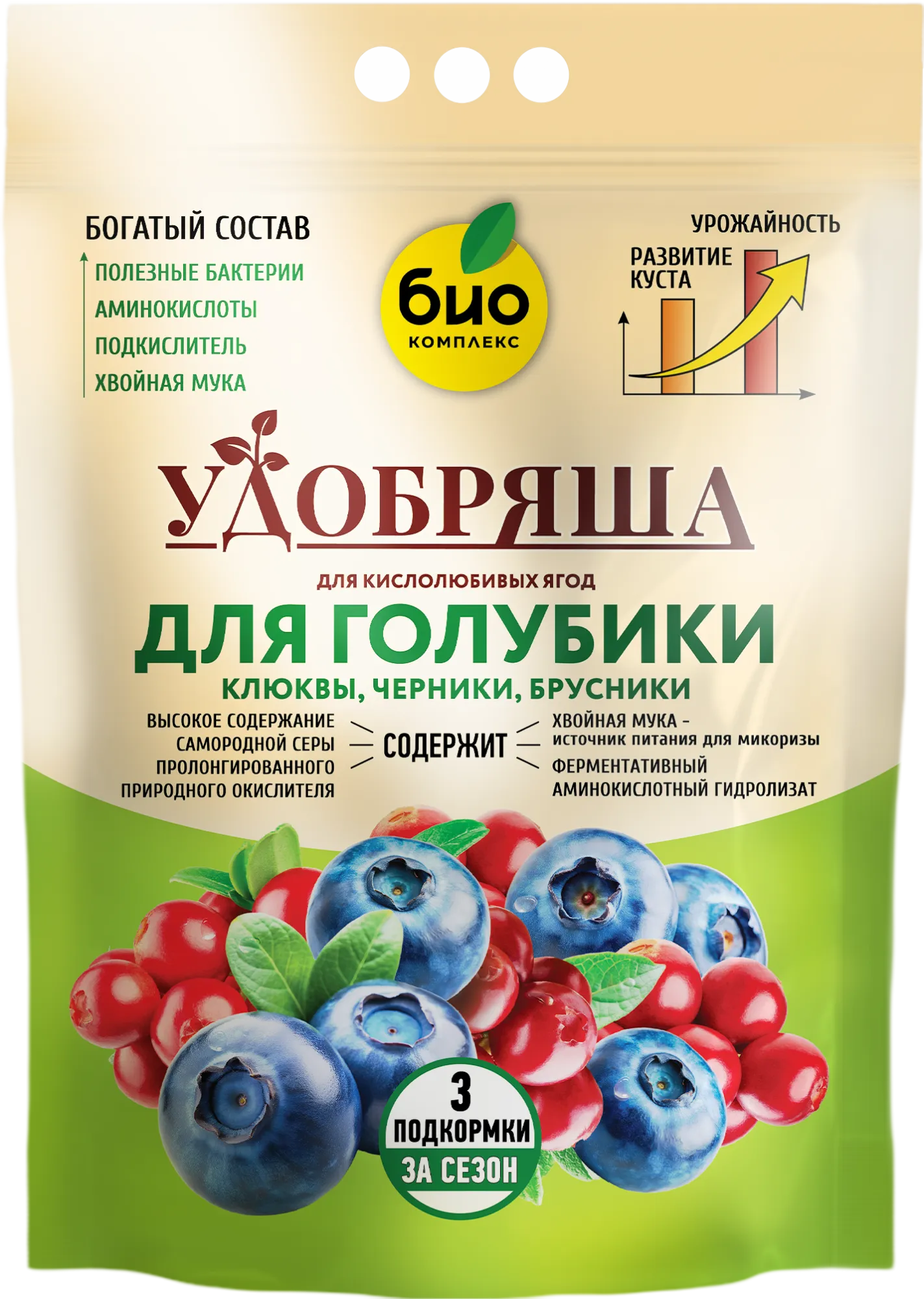 УДОБРЯША для КИСЛОЛЮБИВЫХ ЯГОД – органическое удобрение с витаминами, аминокислотами и полезными почвенными бактериями. Содержит подкислитель в необходимой дозировке – дополнительного подкисления не потребуется!