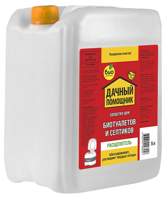 Инновационное жидкое концентрированное средство для ускоренной очистки биотуалетов и септиков - разлагает биологические отходы, обеззараживает, дезодорирует.